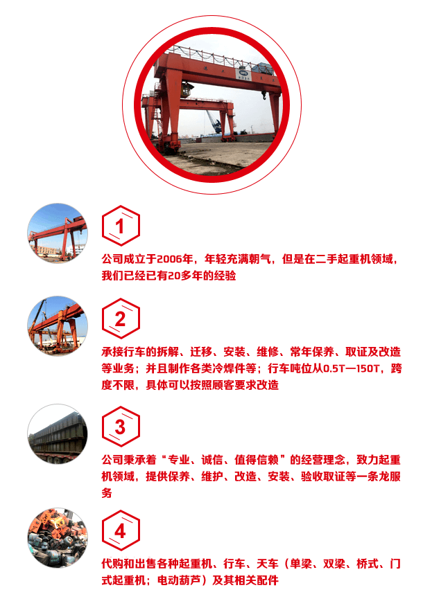 上海礦升起重設(shè)備有限公司位于上海市寶山區(qū)—中國(guó)的鋼鐵基地,公司成立于2006年,年輕充滿朝氣,但是在二手起重機(jī)領(lǐng)域,我們已經(jīng)已有20多年的經(jīng)驗(yàn)。我們專業(yè)經(jīng)營(yíng)二手起重機(jī)及其相關(guān)配件。公司秉承著“專業(yè)、誠(chéng)信、值得信賴”的經(jīng)營(yíng)理念,致力起重機(jī)領(lǐng)域,提供保養(yǎng)、維護(hù)、改造、安裝、驗(yàn)收取證等一條龍服務(wù)。